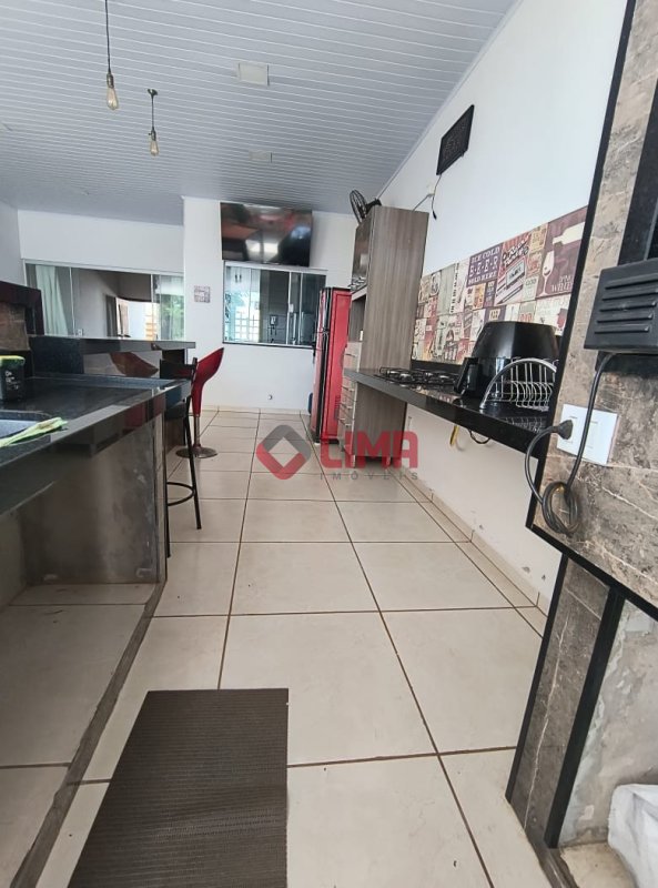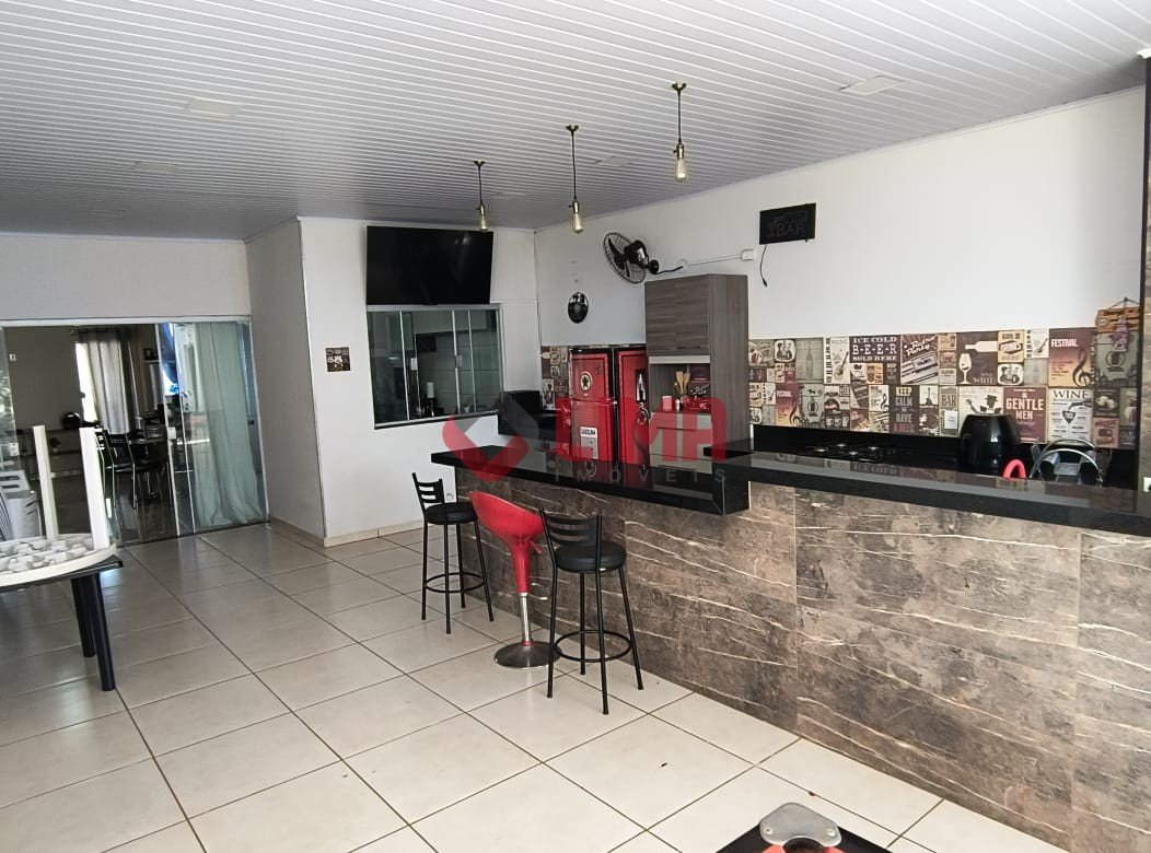 Área de lazer com churrasqueira e fogão, balcão com leds, banheiro e enorme quintal.