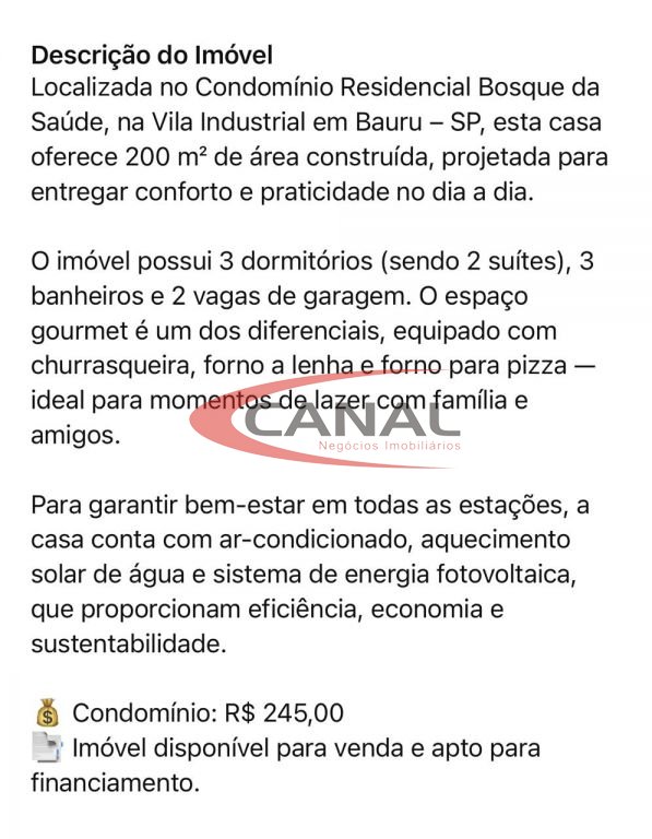 Casa de Condomínio com 3 quartos, 220m² à venda em Parque São João em Bauru