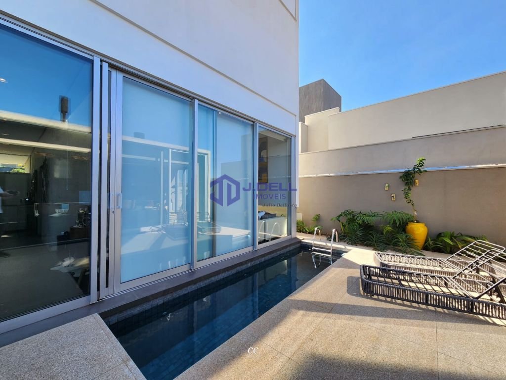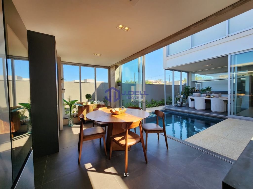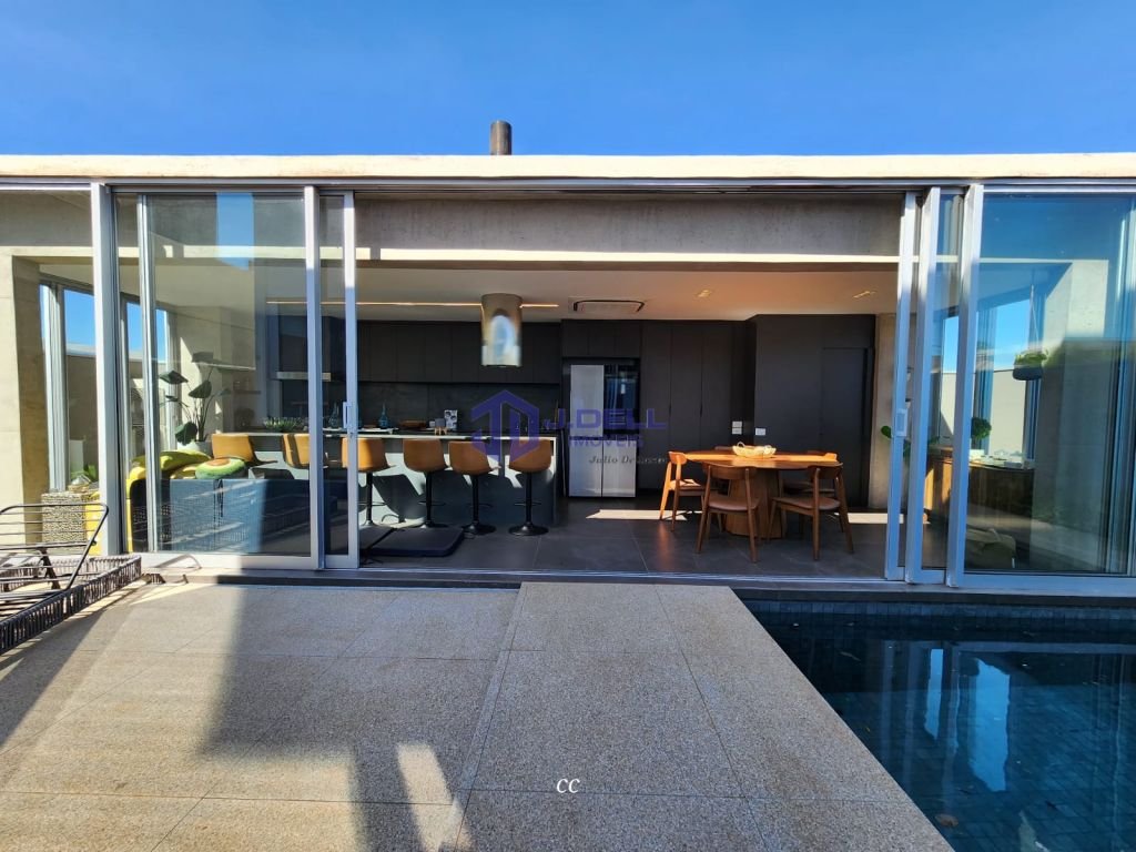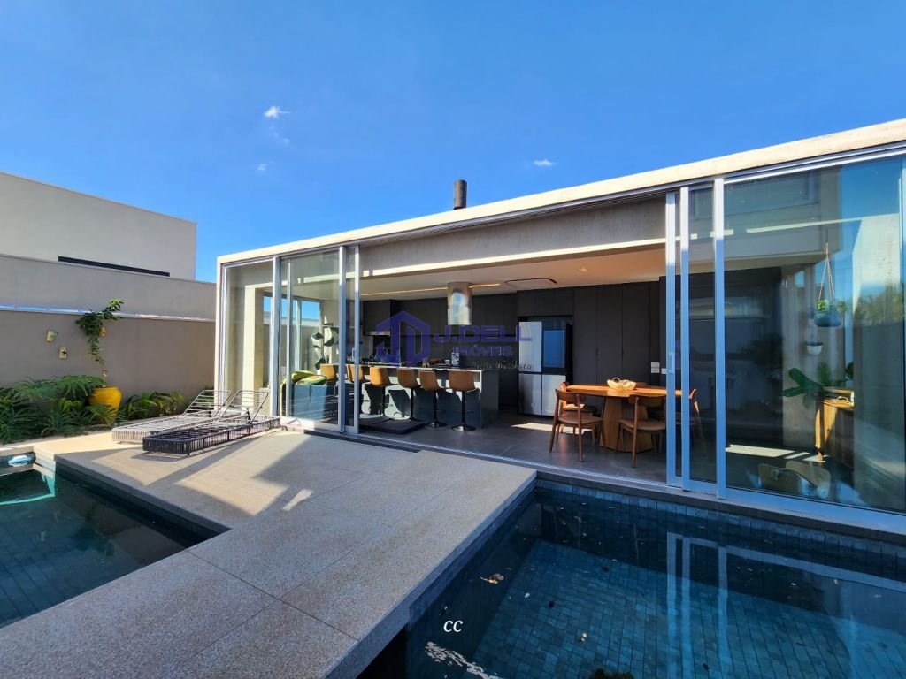 Residência com arquitetura moderna, marcada por grandes porta de vidro, ambientes naturalmente iluminados e integração entre os espaços.