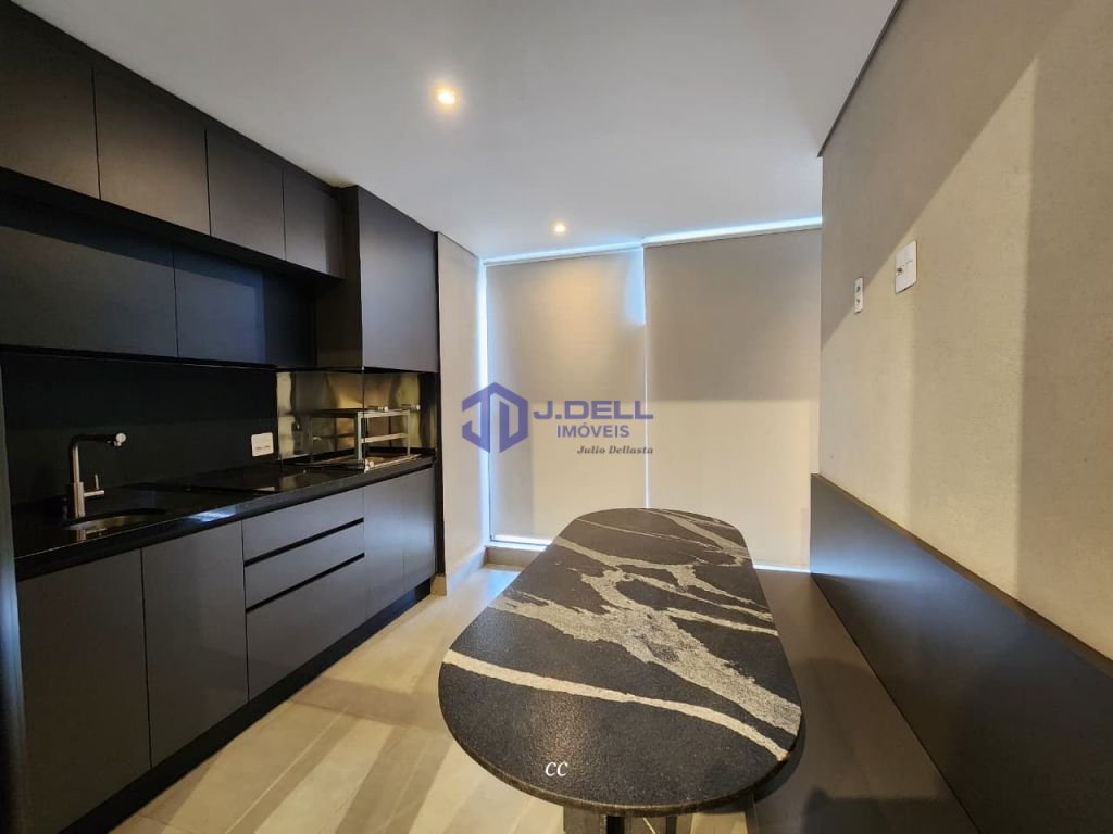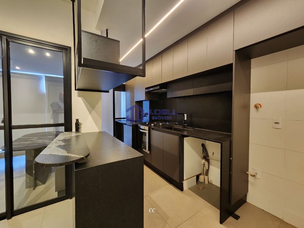 Sala 2 ambientes, lavabo, cozinha americana equipada com fogão, varanda gourmet envidraçada, banheiro social, lavanderia