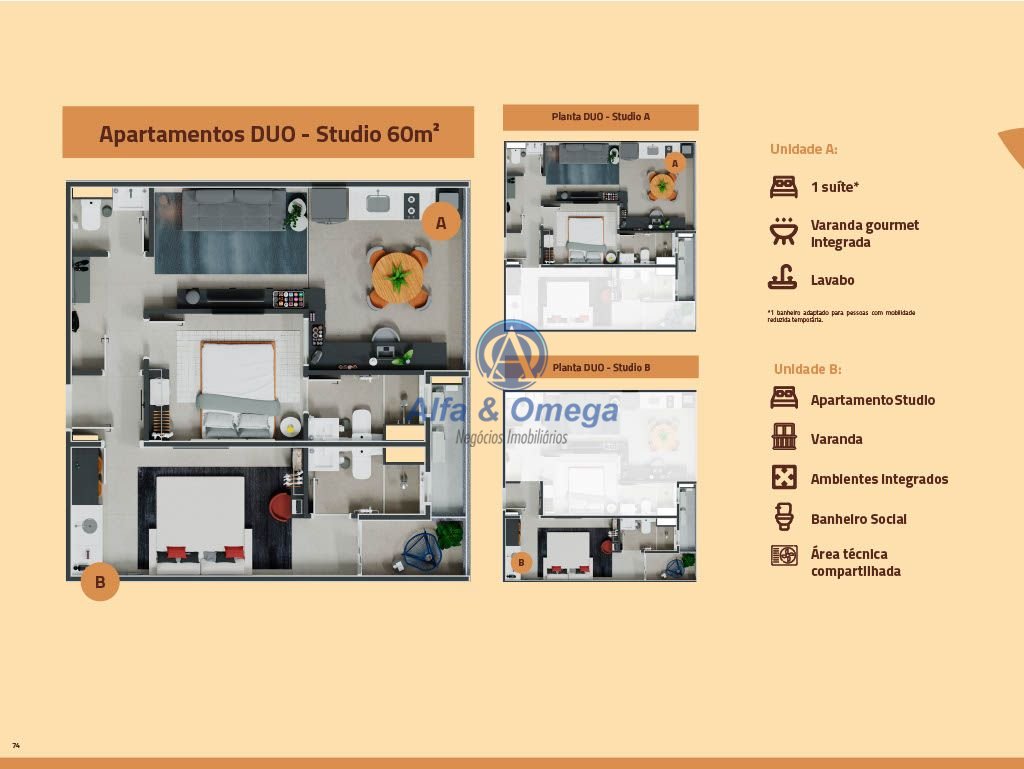 60 m² - Studio Duo - A - 1 suíte e B - Apto studio