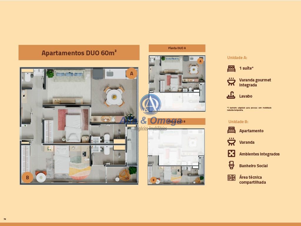 60 m² - Duo - A - 1 suíte e B - Apto