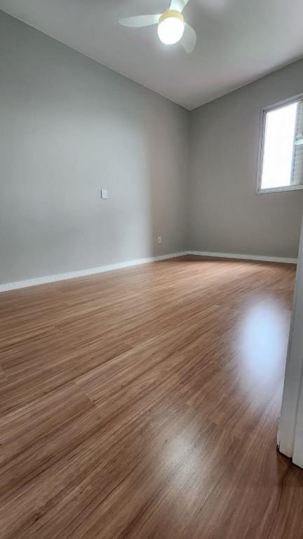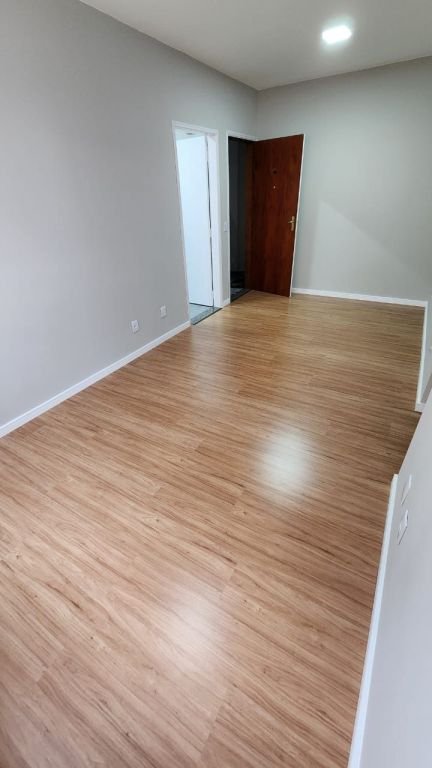 Piso vinílico na cozinha e no banheiro, bem como piso laminado no restante do apartamento