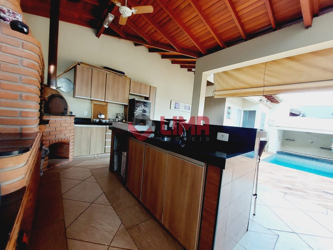 Área Gourmet com churrasqueira e forno a lenha, piscina aquecida com cascata, quartinho e banheiro.