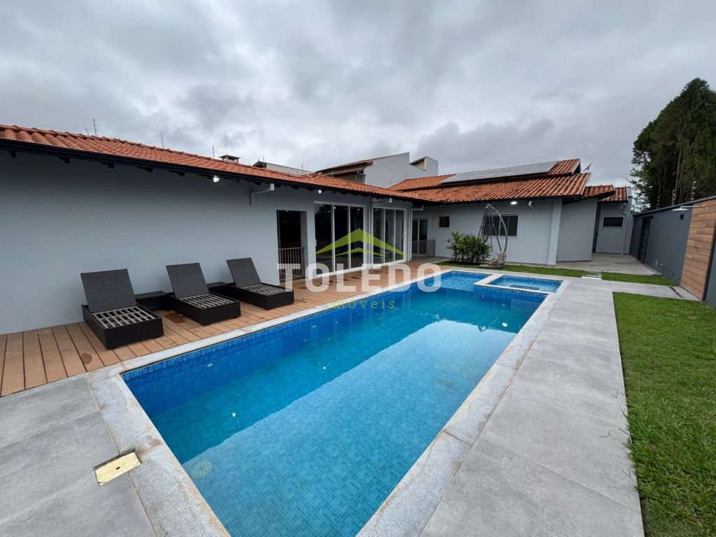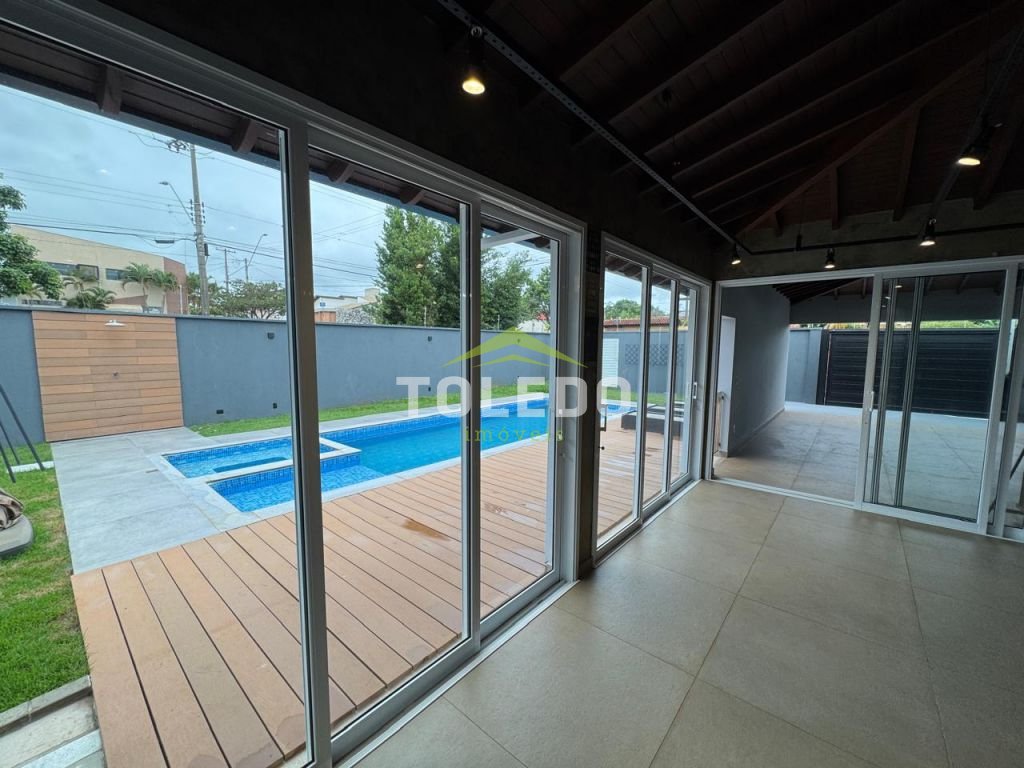 3 dormitórios sendo todos suítes, sala de tv, sala de jantar, cozinha planejada, 5 banheiros, estar home, lavabo, espaço gourmet amplo com churrasqueira, 2 piscinas sendo uma com hidromassagem, sala de jogos, despensa, banheiro externo, garagem coberta para 2 carros.