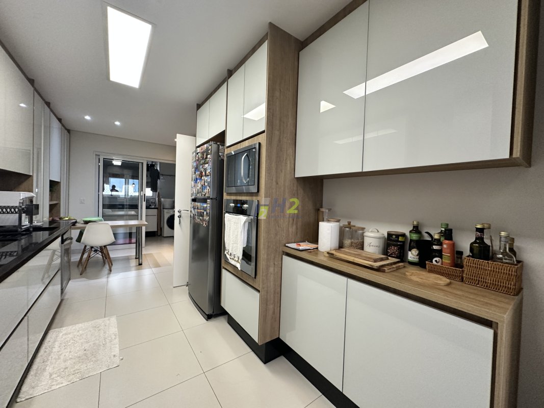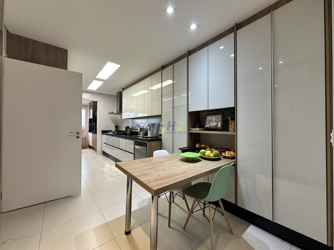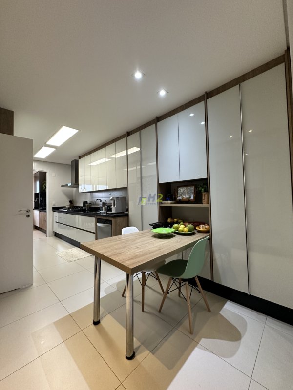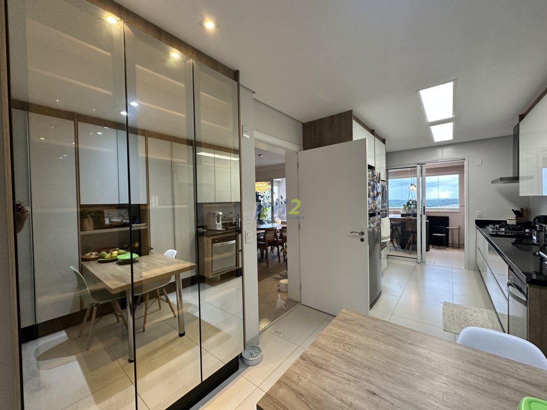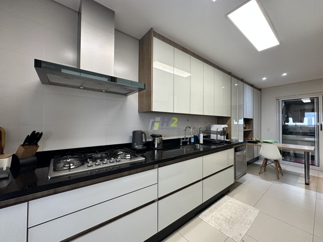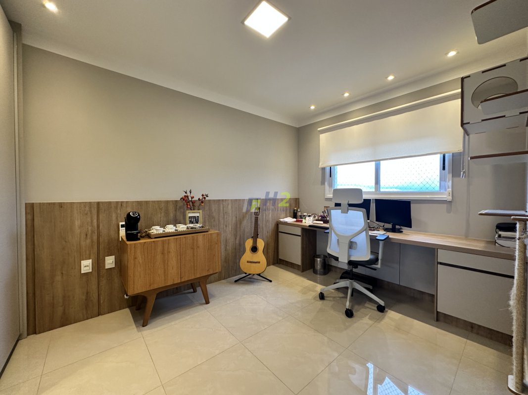 Sala 2 ambientes, lavabo, sala de home, escritório, banheiro social, varanda gourmet integrada com a sala, cozinha planejada, lavanderia, wc de serviço, 3 vagas de garagem e depósito.